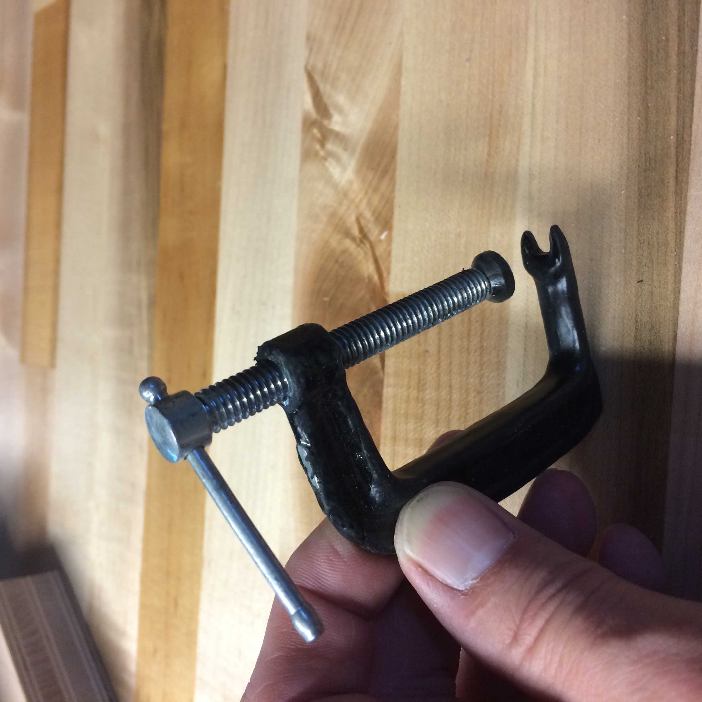 Here's a little device that we made in the shop since we've restrung quite a few Baldwins with Accu-just pins. It's based on an old Baldwin Factory tool and is simply a 1" or 2" c clamp with the end of the frame ground thinner (to allow more clearance between the string and the surface of the plate) and a notch cut in the end to fit around the accu-just pin. Driving the string down on the pin is pretty easy but this makes lifting the string (to decrease downbearing) easier.
