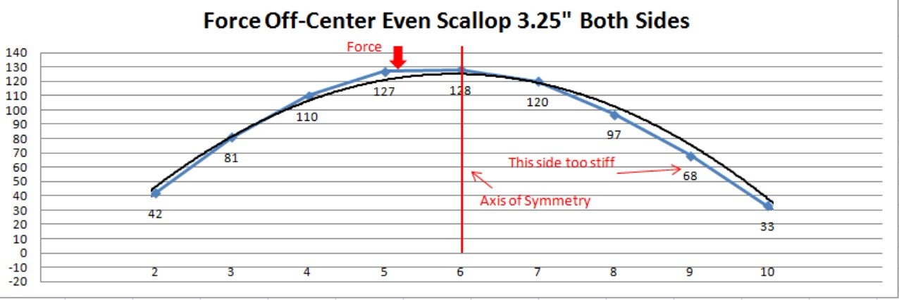 I understand the reasoning for the radial rib pattern and where it comes from. However, it also places the ribs closer together on one side (bent side) and farther apart on the other. How does that affect the stiffness of the assembly or how does one side of the assembly being stiffer than the other affect the tonal response or, more to the point, how would it affect my rib scale design. Can't say.