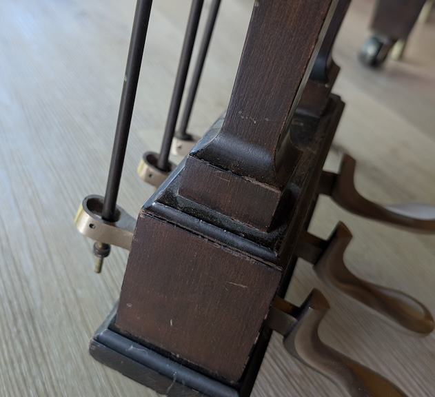 A customer sent me this picture of this small Brambach grand that arrived from a relocation missing some pins that secure the rods to the pedals. I'm unfamiliar with this set up. Are there parts missing?