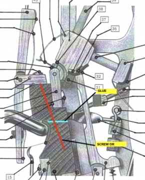 The blue line is where the glue joint is more or less. The red line is where I put the screws and/or dowels after gluing and clamping as best I can. I haven't seen one that completely separates but have seen them separate all the way down to the beginning of the bass. Some but not all of the dampers and whippens need to be removed. Reinforcement can also be put in on the 'shelf' below the hammer flange but that is a weak point too, I recommend at least a few diagonals be installed too.