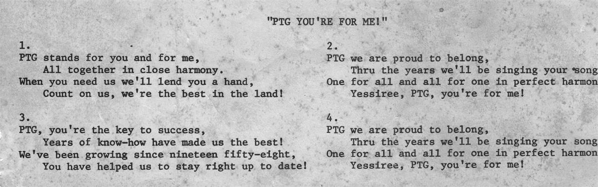 In retiring the business operations of my office, I came up with this slip of paper with lyrics to a PTG "anthem". I'm guessing it's from the Hollywood FLA national convention. (Back in the day - me, in my mid-20s, I attended also ones in NYC, Philadelphia, and Cincinnati: '74, '76 and '78 respectively.)