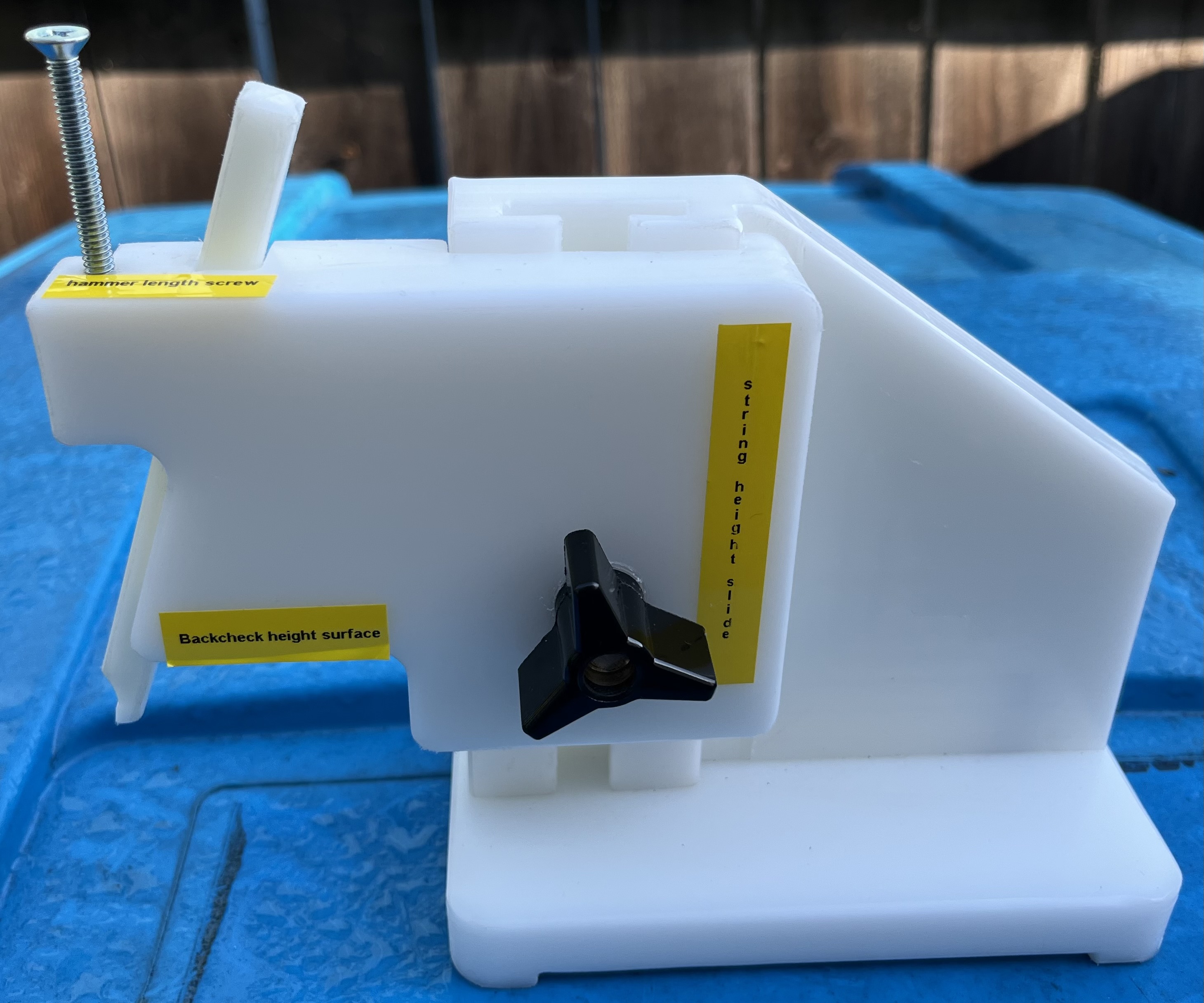 Wessel, Nickel & Gross Backcheck Line and Height Jig - this is a part of the set they sell as the Backcheck Tool Kit, for $495. 14-page instruction sheet included and available at www.wesselnickelandgross.com Helps you figure out location on keys to install back checks, and height they should be installed for proper checking. I added labels identifying parts to make it easier to use. Designed for use with WNG back checks, but is supposed to do the same for conventional wood back checks. $200 Including shipping