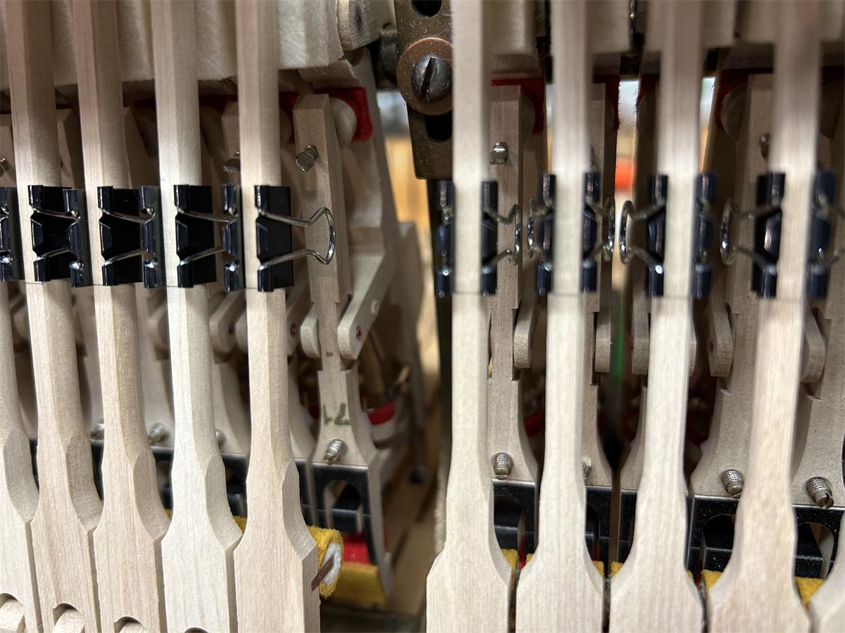This came up in another thread so I thought I'd post for the sale of interest. This is my current approach to allow for adjustments to the touchweight (and inertia). I set the TW with these clips attached (mini binder clips) to 37g BW with FW (at C40) of about 25 grams. That's about 85% of Stanwood FW max (my default setting). By moving the "slider" up or down the shank you get about 4 grams range in the BW (~35 - 39 g) and accompanying inertia decreases or increases. In this photo I've not yet removed the handles. I place the opening up on the shank which allows you to spread them easily with a wide blade screwdriver to slide them up or down. (BTW the lines on the hammers are voicing quadrant guidelines, I leave them there).