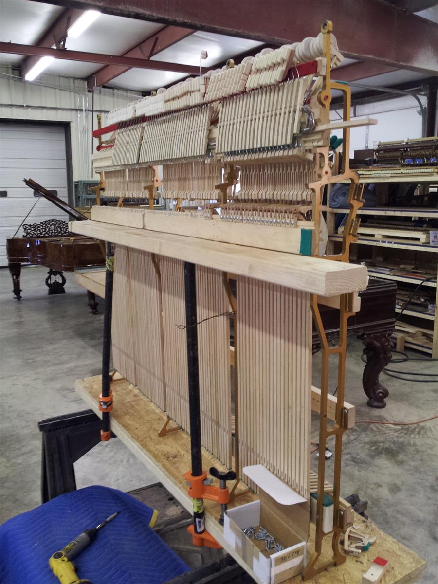 Dealing with one of the longest tenor breaks of any piano, I started with having to make 4 over dampers. But through much tweeking I was able to eliminate 3 of them and was left with one, which was from a node problem. To make the over damper is easy- bend music wire to shape with a loop at the top to sandwich the back of the damper head with another piece of felt.