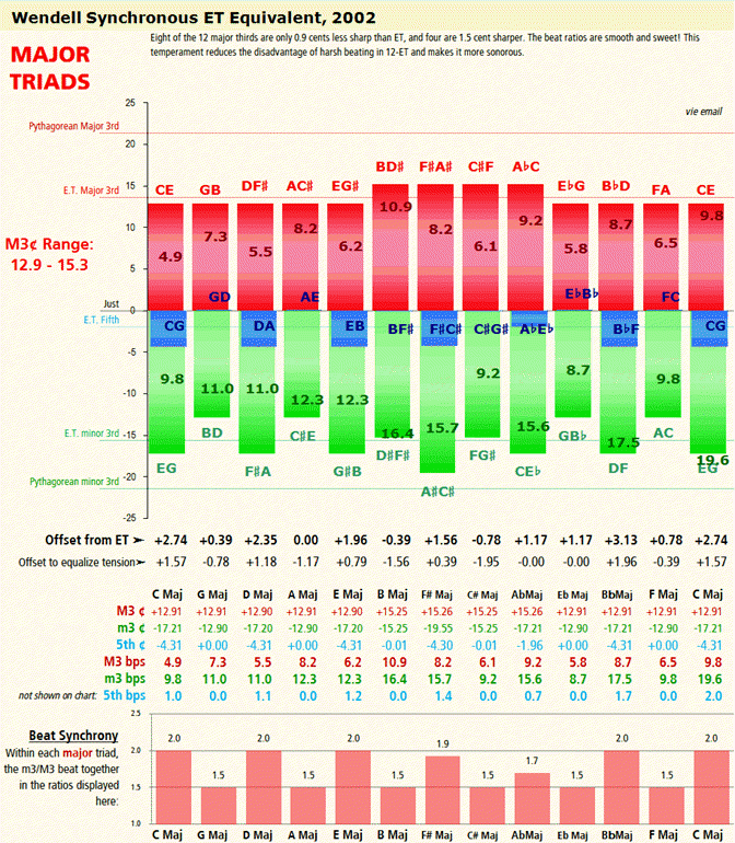 Here is another "nearly equal" with a different goal - to syncronize the combined beats between the M3/m3 in a triad. An interesting spreadsheet creation. The bottom part of the graph shows the ratios.