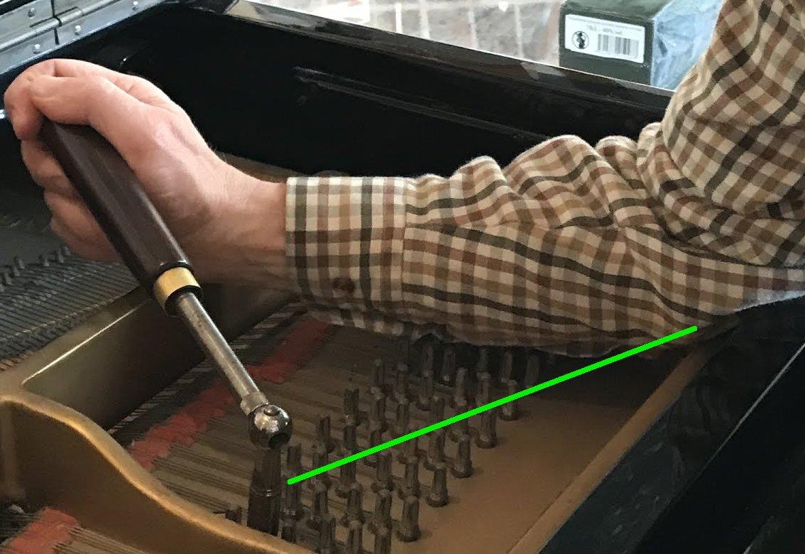 The instructor was demonstrating tuning and doing so standing up. Instead, generally I advocate sitting down and specifically resting my arm over the front of the frame of the instrument and by doing so limit movement to what is made possible by wrist and fingers.