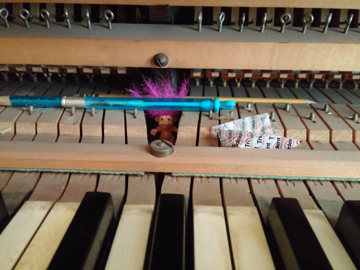 Another customer whose piano I serviced regularly had a couple notes in the middle that were making funny rattling noises. I opened it up and found something the young daughter had lost, and missed. It was looking right at me, sort of laughing at having been discovered in its hiding place. Daughter was glad to have it back.