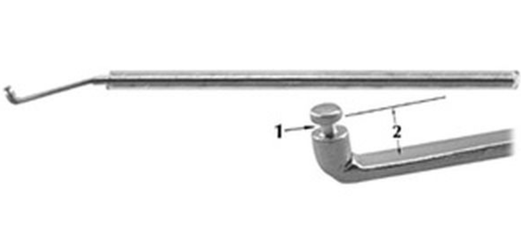 "Another unique advantage of this spring tool is shown as item (2) in the diagram. The distance from the flat side of tool to the notch equals the measurement from the side of the repetition lever to the center of the spring seat. Grand repetition springs can be removed and replaced without any guesswork. "