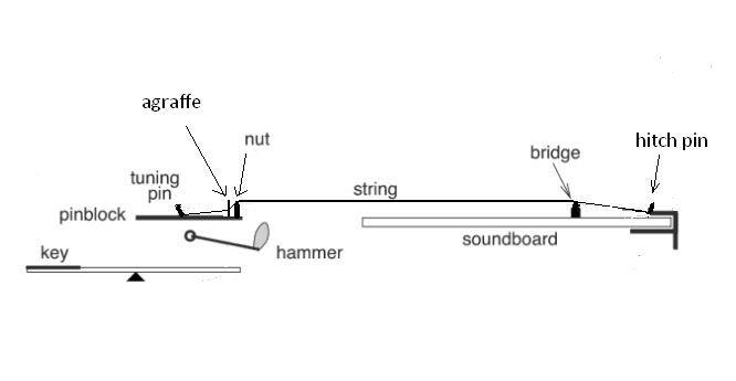 "As you know in a piano the strings, from the agraffes to the pinblock, are not parallel to the floor, they don't go downwards, but they rise upwards (the opposite of violin or a guitar etc),"