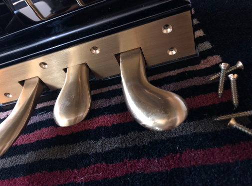 Place the legs on caster cups to elevate the piano. With the lyre pressed into the carpet the keybed is also bowed upwards and you have a loss of key dip.You also have to remove the pedal rods from their cups in order to remove the face plate.