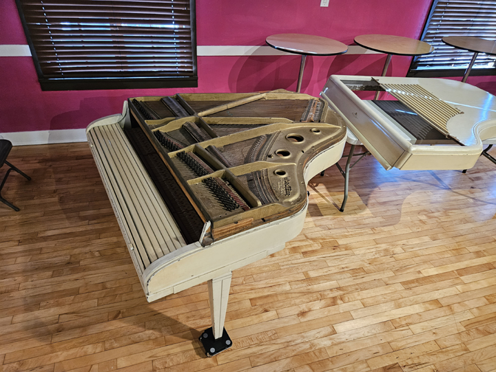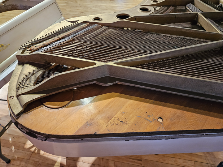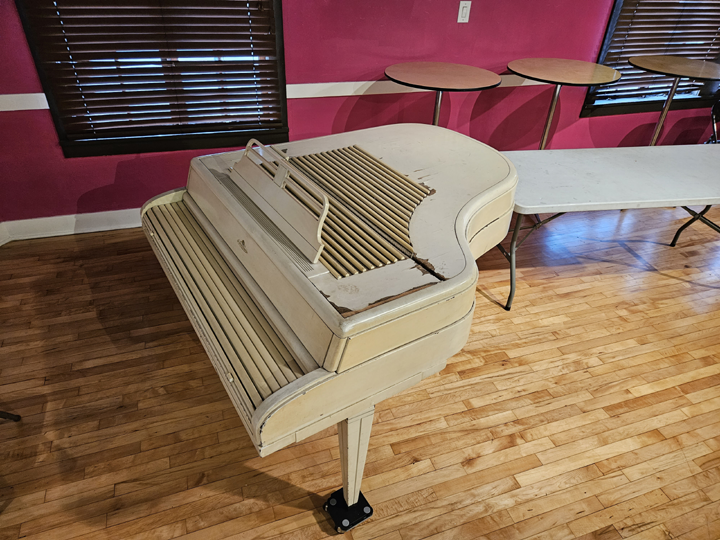 What is this thing? This customer depends on found and donated pianos, changing them out frequently it appears. Last time I was there they had 1925 Marshall & Wendell baby grand that may have been worth the work to make it better. This time I found this... thing. Discounting the obviously miserable condition I'm just wanting to find out what it is. Plate casting and fallboard and soundboard decals tell me it's a Wurlitzer. All other identifying marks have been painted over so the only potential identifier is the number cast in to the plate. The top is wood but the sides are metal and the top has to be lifted off the piano for access to pins and strings. Any idea what this is, and when it may have been made?