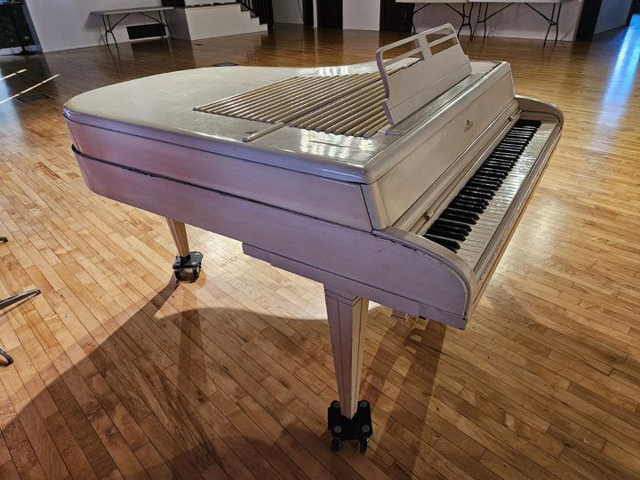 Sort of like art deco / designer inspired. The metal case sounds interesting- I like the lift off top !!!! Baldwin and Wurlitzer had some interesting pianos with some models having chrome legs, various inlays, vinyl or naugahyde cases and lids. This model may have been for a bar, lounge, cruise ship. I think there was an aluminum piano made by Ripkin and used on cruise ships. The piano may very well be worth doing over. IOt probably will be post WWII 1950's